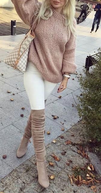 This warm and stylish combination of a chunky brown sweater and white skinny jeans screams fall and winter fashion. Brown suede knee-high boots and a plaid bag complete the look, perfect for a crisp afternoon walk.