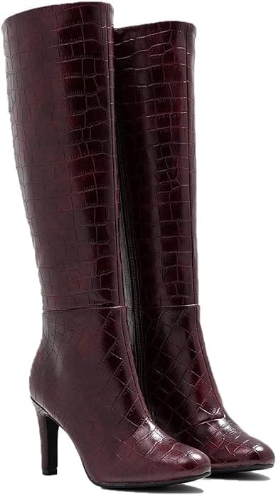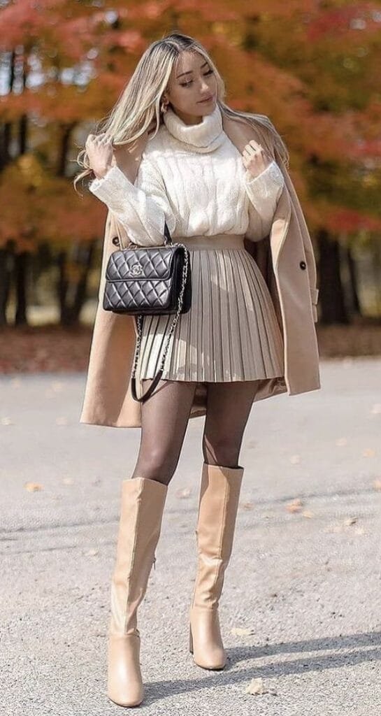 Elevate the look with nude High Heel Knee High Boots and accessorize with Pearls and Rhinestones Evening Handbags. This ensemble exudes warmth and style, making it perfect for a stylish fall gathering with a touch of classic charm.