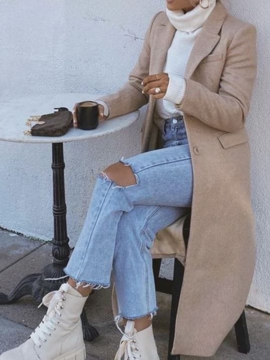 31. Turtleneck Sweater with Distressed Jeans and a Wool Blend Coat