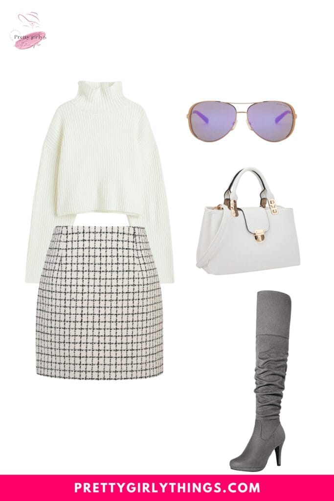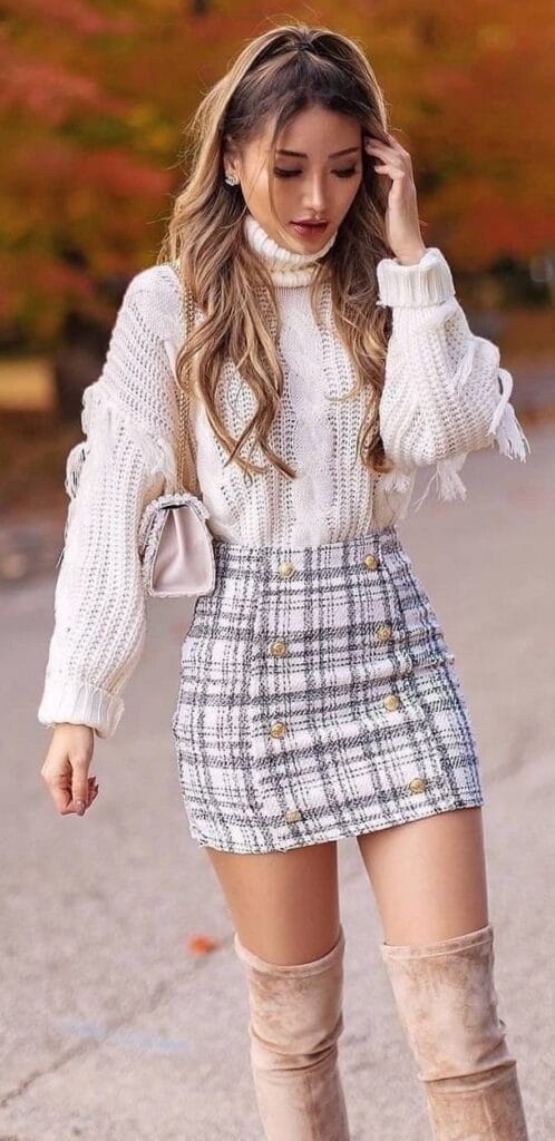 Embrace cozy elegance this Thanksgiving with a White Bodycon Turtleneck Cable Knit Sweater paired effortlessly with a Knee Casual Plaid Mini Skirt.