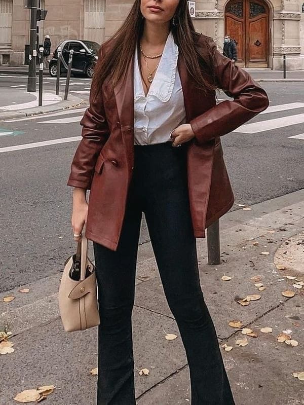 Achieve timeless sophistication this Thanksgiving with a combination of White Button Down Shirts, a Brown Leather Blazer, and Black Trousers Long Straight Suit Pants.