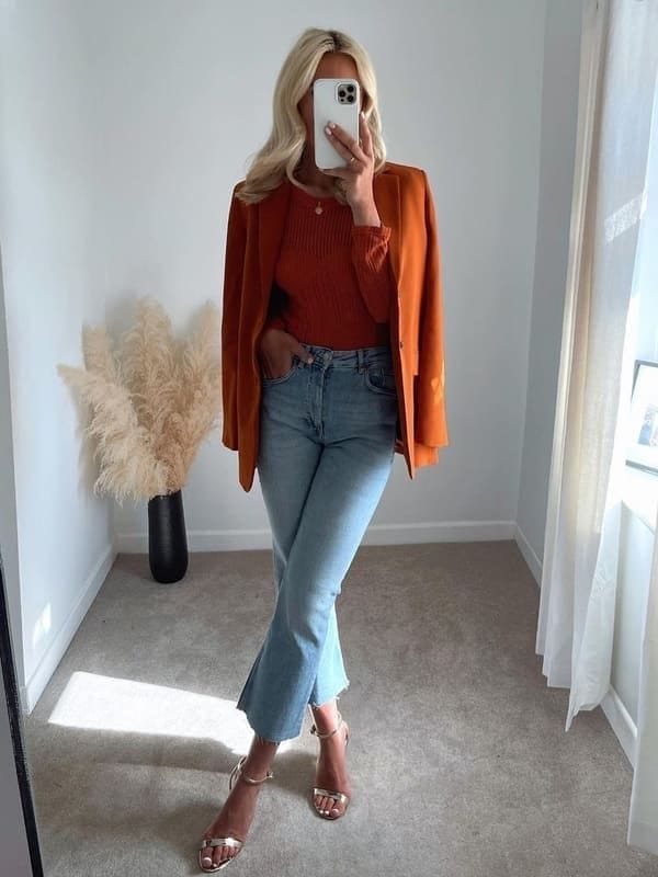 Embrace the vibrancy of autumn with an Orange Turtleneck Sweater paired confidently with an Orange Front Button Work Blazer Jacket.
