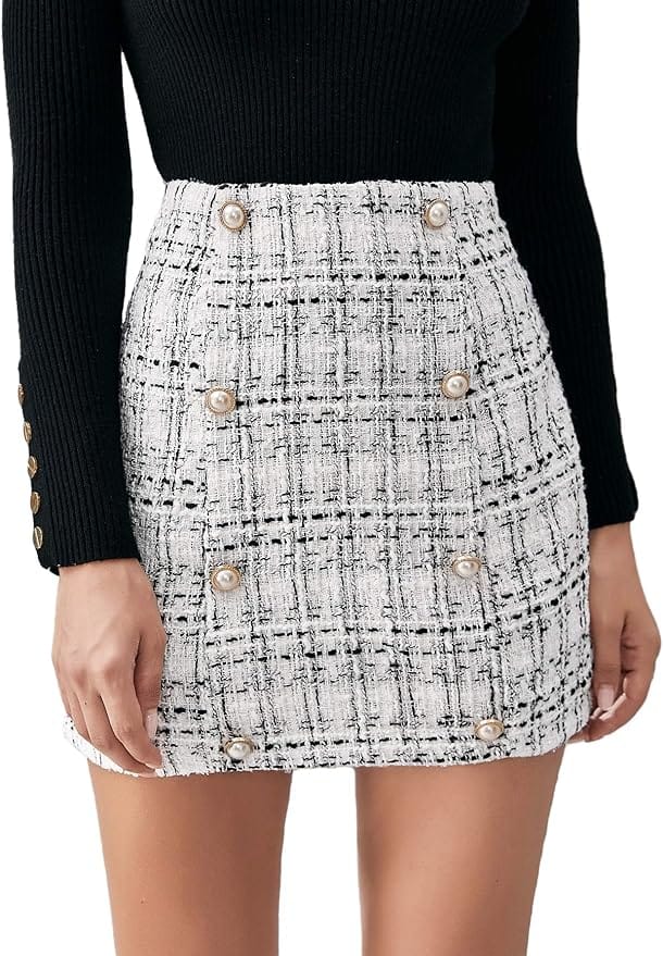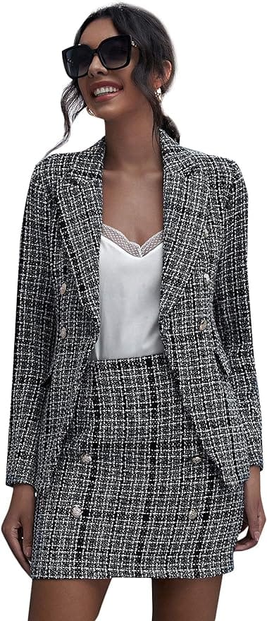 Embrace the essence of power dressing with a Women’s Business Suit 2-Piece Tweed Blazer Jacket and Skirt Set. Pair it with a sophisticated Square Neck T-Shirt Top and elevate your look with High Stiletto Pump Heeled Sandals.