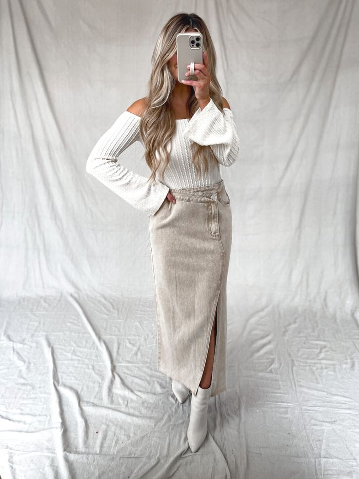 Achieve effortless elegance this Thanksgiving with a White Off-Shoulder Oversized Pullover Sweater paired seamlessly with an Apricot Bodycon Pencil Skirt featuring a stylish slit.