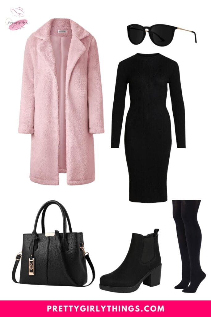 Keep it sleek with Top Tights in black and complete the ensemble with matching black accessories, including a handbag and shoes. This outfit effortlessly combines warmth and style, making it perfect for a stylish fall gathering with a touch of sophistication.