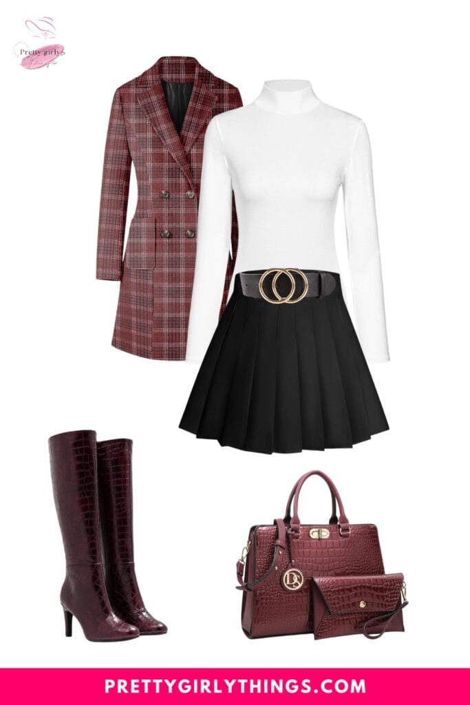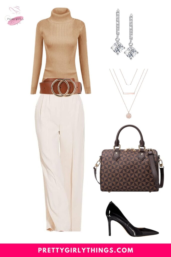 Pair it with a Turtleneck Mock Neck Ribbed Sweater, a coordinating Black Belt, and a Black Handbag for a sophisticated and chic ensemble, perfect for a stylish fall gathering with a touch of classic flair.