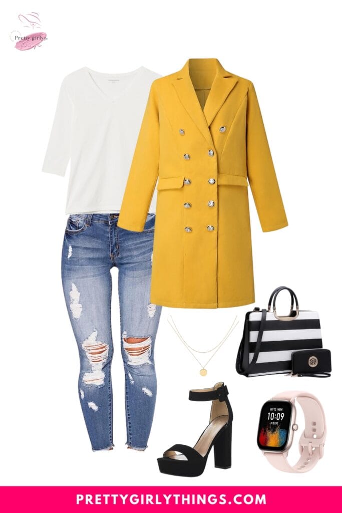 Achieve effortless chic for Thanksgiving with a White 3/4 Sleeve V-Neck T-Shirt and High Waist Skinny Stretch Ripped Jeans. Add a touch of elegance with a Wool Coats Double Breasted Midi Peacoat Trench Coat and Women’s Hi-Lo High Heel. Complete the look with a Smart Watch and a stylish Handbag Top Handle Shoulder for a relaxed yet stylish fall gathering.
