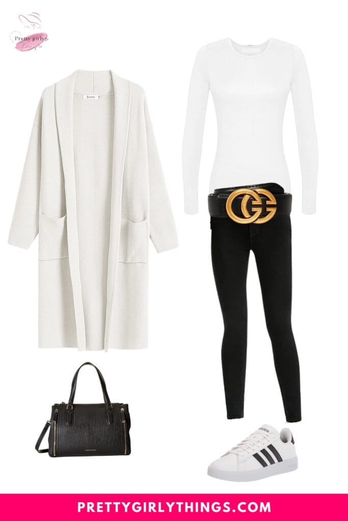 Achieve a casually chic Thanksgiving look with a Women’s Long Sleeve White T-Shirt paired with High-Rise Straight Black Jeans. Elevate the style with the Calvin Klein Reyna Novelty Black Handbag, adidas Women’s Grand Court 2.0 Tennis Shoes, and a sleek Metal Buckle Leather Belt.