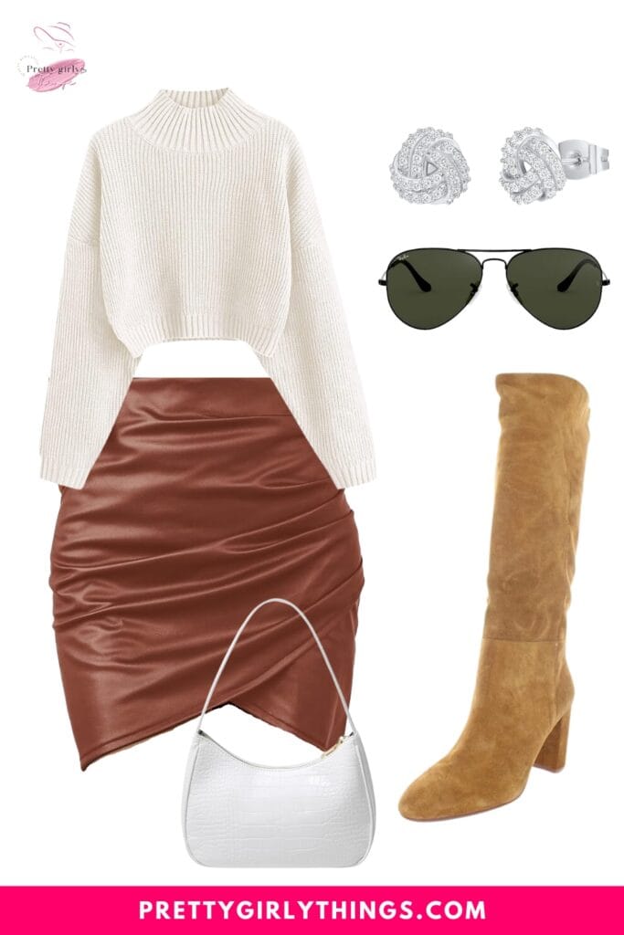 This ensemble pairs a cropped turtleneck sweater with a leather bodycon skirt for a trendy Thanksgiving look. The turtleneck keeps you warm, while the leather skirt adds sophistication. Finish it off with krafty knee-high boots for a stylish and confident appearance at your Thanksgiving gathering.
