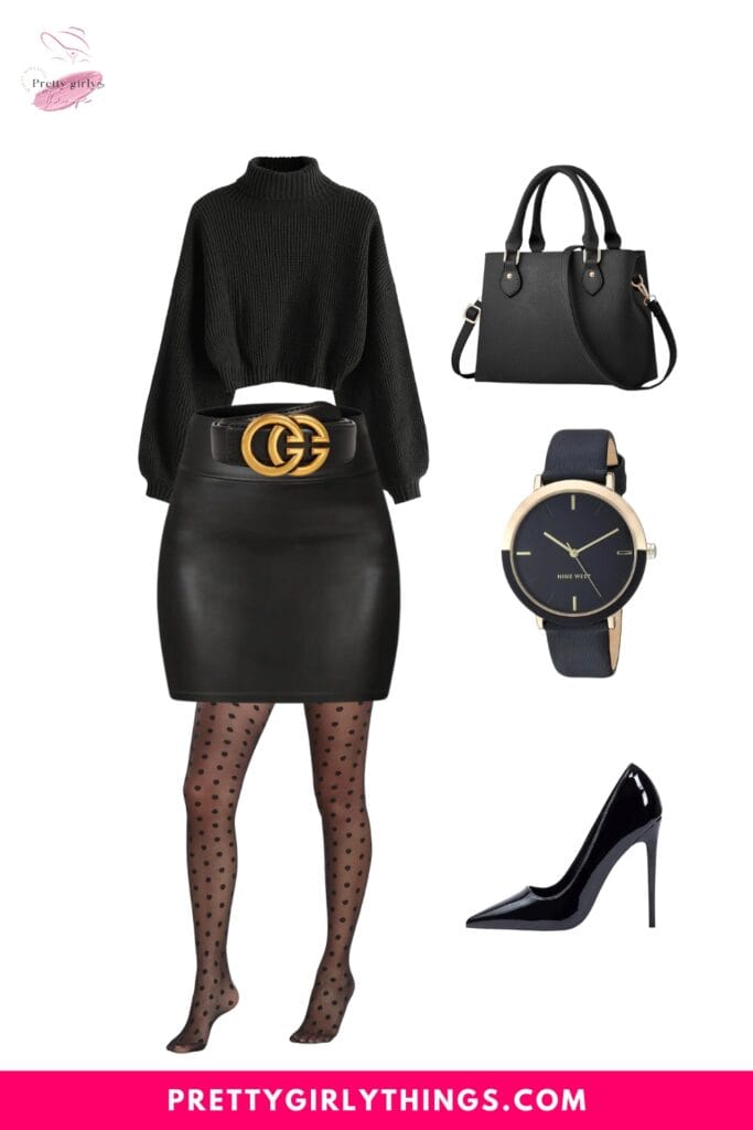 Achieve a sleek and chic look for Thanksgiving with a Black Turtleneck Sweater paired seamlessly with a Black Leather Skirt Pencil Short. Add a playful touch with Polka Dot Black European Tights and complete the ensemble with black shoes, a black watch, and a black belt.