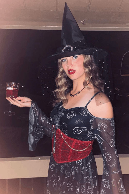 This classic witch costume is always a Halloween hitācomplete with a pointy hat, dark celestial-print dress, sparkling necklace, and a bold red corset for a touch of drama. Itās creative, whimsical, and just witchy enough to be both cute and a little mysteriousāperfect for solo spells or twinning with a coven of besties!