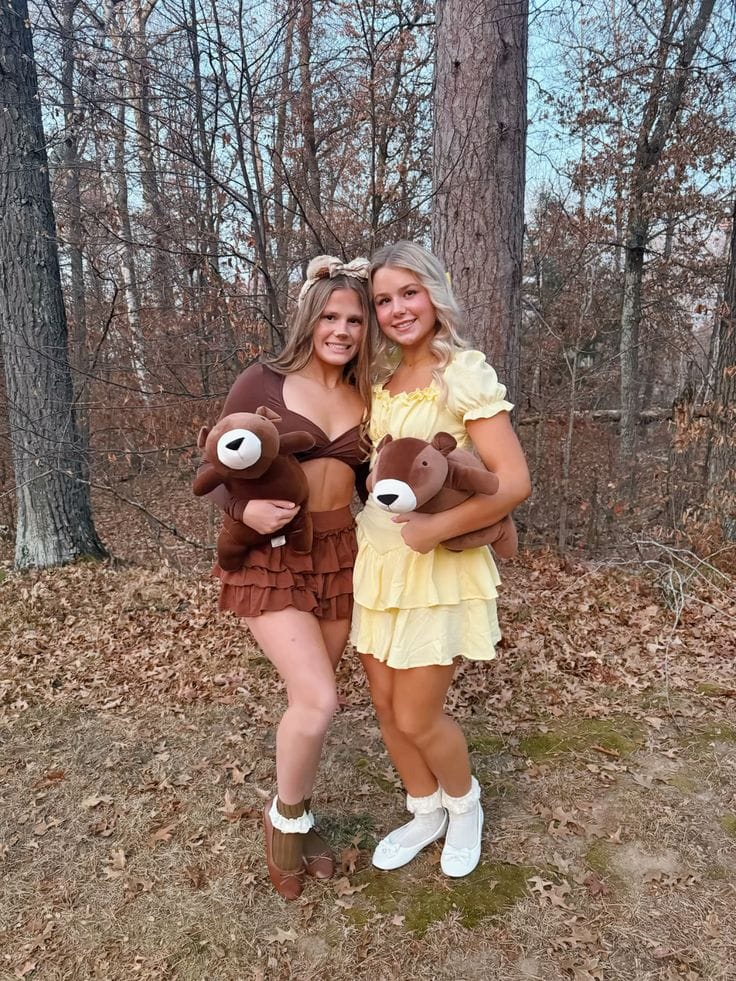 These too-cute teddy bear costumes are perfect for siblings or bestiesāsoft brown and honey yellow dresses, bear ear headbands, and matching plush teddy props! Adorable, cozy, and totally on-theme for fall, theyāre creative, easy to pull off, and look amazing together at any party or for festive family photos.