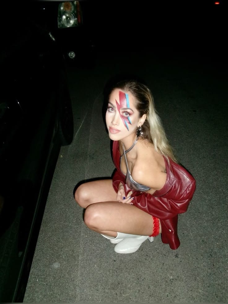 This stunning David Bowie costume perfectly captures the legendary Aladdin Sane era with the iconic red and blue lightning bolt face paint that became one of the most recognizable images in rock history. The metallic red leather jacket and dramatic makeup create an electrifying tribute to the Starman himself, making this an unforgettable Halloween look that channels Bowie’s theatrical glamour and artistic genius.