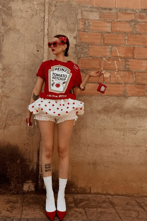 This Heinz Ketchup Bottle costume is quirky, bright, and totally originalāfeaturing the iconic label tee, dotted tutu ācap,ā and fun red accessories. The playful skirt and mini ketchup purse add creative details, making it perfect for standing out at any Halloween party or pairing up with friends dressed as mustard or fries!