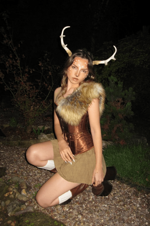 This enchanting woodland deer costume is pure autumn magicāa faux fur shrug, earth-toned corset and skirt, and big antlers for a whimsical, fairytale vibe. The knee socks and boots add cozy, rustic details, making it perfect for Halloween, fall festivals, or a group woodland creatures theme with friends!