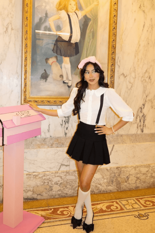 Channeling the beloved childrenās book character, this Eloise-inspired costume is absolutely charmingācomplete with a crisp white blouse, black skirt and suspenders, and a signature pink bow. The details and playful backdrop make it adorable, creative, and perfect for anyone wanting a sweet, storybook-themed Halloween look!