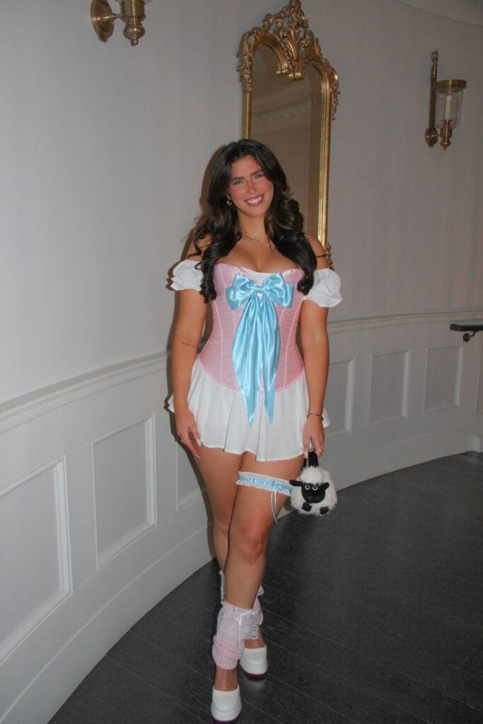 This costume perfectly captures the classic charm of Little Bo Peep, featuring a pink corset, fluffy white skirt, oversized blue bow, and cute sheep purse. Itās whimsical, sweet, and ideal for anyone looking for a playful and instantly recognizable fairytale look for Halloween!