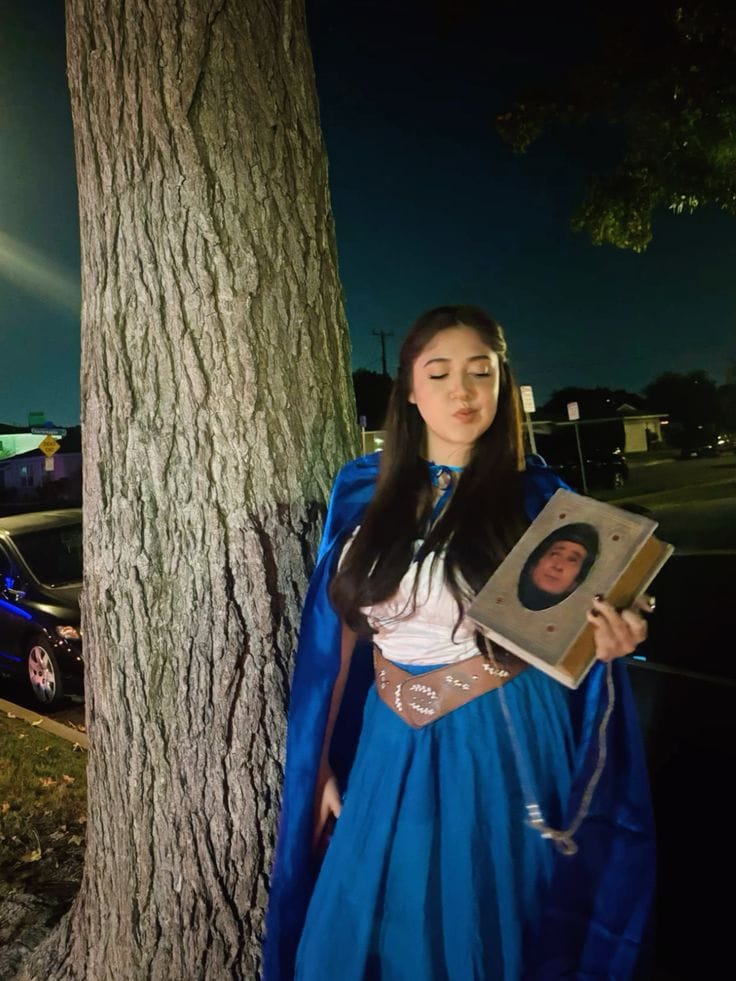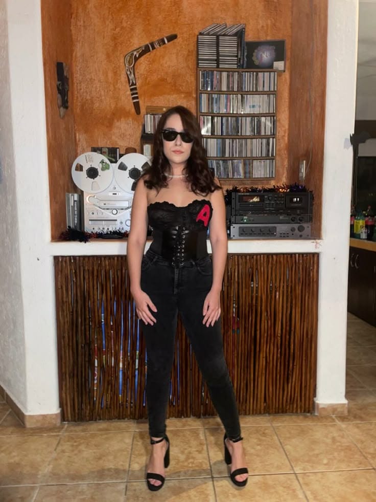 This creative costume references Hester Prynne from “The Scarlet Letter,” featuring all-black attire, a lace-up corset, and the bold red “A.” Paired with sunglasses, it puts a modern, edgy twist on the classic literary characterāfun, unique, and clever for Halloween!