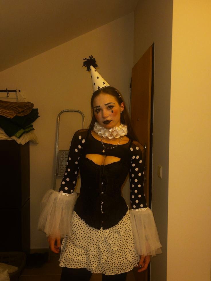 This trendy Halloween costume is a creative take on Pierrot, the classic sad clown from French pantomime. With a ruffled collar, cone hat, dramatic polka dots, tulle sleeve cuffs, and expressive makeup, itās both vintage-inspired and perfectly moody for a night of Halloween fun!
