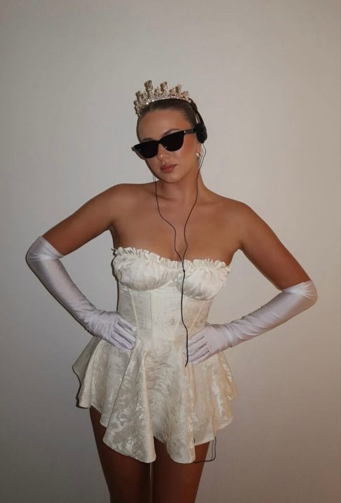 This Halloween costume is a classic princess look, featuring a white strapless dress with a corset bodice, white gloves, and a gleaming tiara. Itās elegant and versatile, ideal for fairy-tale royalty, a modern take on a storybook princess, or even a glamorous interpretation of a character like Princess Tiana or Cinderella!