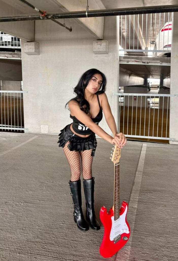 This Halloween costume is all about rock star energyāleather and fishnet, dramatic boots, and a graphic āBITā (possibly short for āBITCHINāā) top, plus an eye-catching electric guitar as a prop. Itās fierce, edgy, and perfect for anyone who wants to channel ārock goddessā vibes at a party!