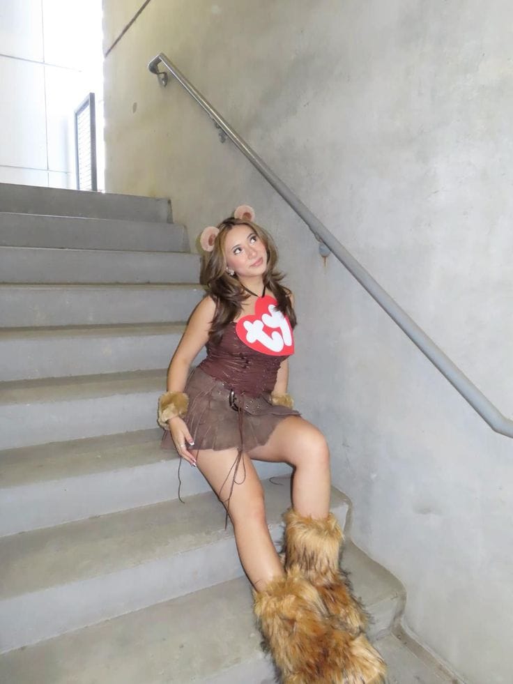 This Halloween look is a playful take on a Beanie Baby bear, featuring fuzzy brown accessories, a brown dress, furry boot covers, and the signature red heart-shaped “Ty” tag. Itās cute, nostalgic, and a great choice for anyone who wants a creative, throwback costume with plenty of 90s flair!