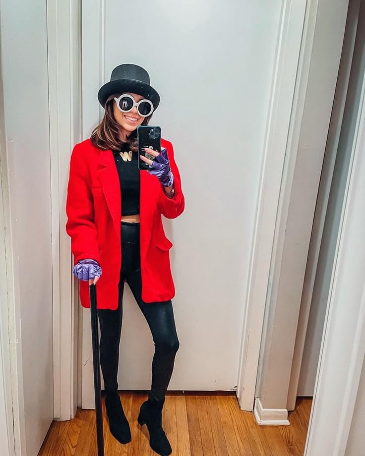 This trendy Halloween costume is a modern, chic take on Willy Wonka. With a bold red coat, classic top hat, black pants, bowtie, cane, and standout purple gloves, it captures the whimsical spirit of the iconic candy maker while keeping things fresh and fashion-forward!