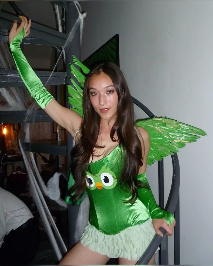 This Halloween costume is a clever, adorable nod to the Duolingo appās iconic green owl mascotābut with a twist! The look features green fairy wings, a shiny green corset with big owl eyes, a ruffled white skirt, and matching long gloves, making it both instantly recognizable and utterly unique for any party
