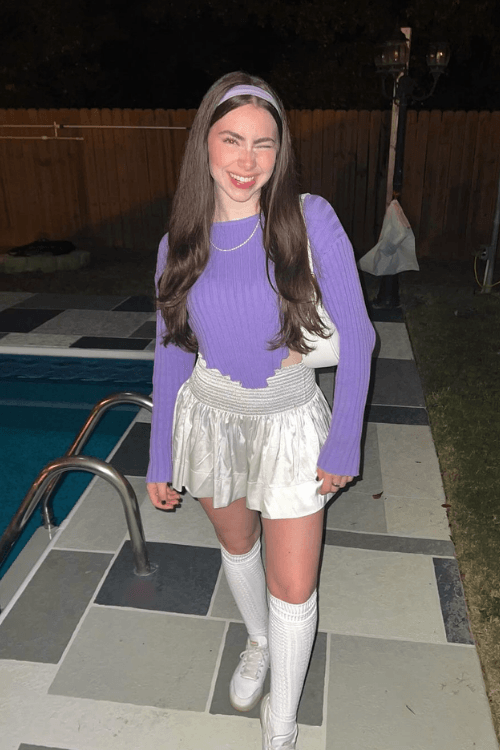 This perfect Trixie Tang costume captures the iconic Fairly OddParents character with a lavender turtleneck, white mini skirt, matching purple headband, and signature white knee-high boots that define her popular girl aesthetic. The long black hair and purple eyeshadow complete this nostalgic Y2K look.