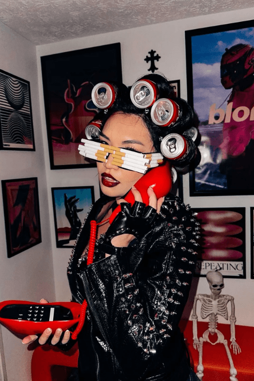 This costume totally nails Lady Gagaās unforgettable look from “Telephone”āthink soda can hair rollers, cigarette sunglasses, a studded black leather jacket, and a retro red telephone for ultimate pop star attitude! Itās creative, instantly recognizable, and packed with personality, making it the perfect pick for anyone who loves a bold, music-inspired DIY moment.
