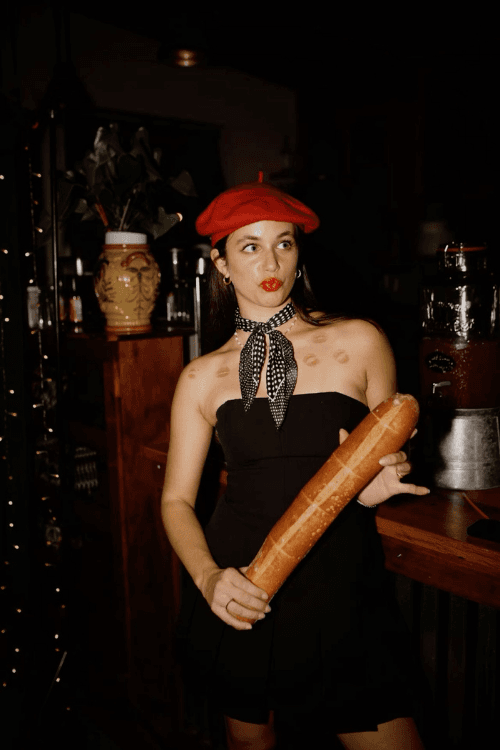 This costume is Parisian perfection with a cheeky touchāa little black dress, a classic red beret, scarf, and a baguette as the ultimate French accessory! The addition of lipstick kisses on her shoulder brings playful, romantic vibes, making this look both adorable and creative.
