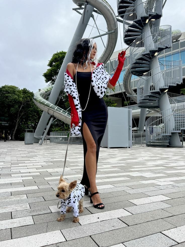 This duo costume is absolutely iconic and adorableāCruella stuns in her dramatic black dress, red gloves, spotted faux-fur stole, and pearls, while her little Dalmatian sidekick is just too cute in matching spots! Itās creative and perfect for pet-lovers, siblings, or friends looking to win best costume at any party.