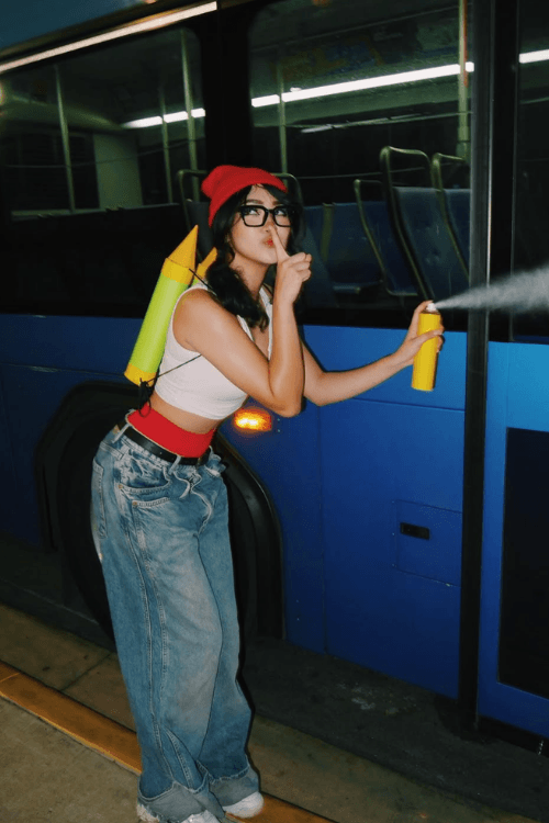 This perfect Subway Surfers Jake costume features the classic red beanie, gray hoodie jacket, denim vest, and baggy jeans that capture the iconic video game character’s urban streetwear aesthetic. The spray paint prop and subway station setting complete this nostalgic gaming-inspired Halloween look that brings the popular mobile game character to life.