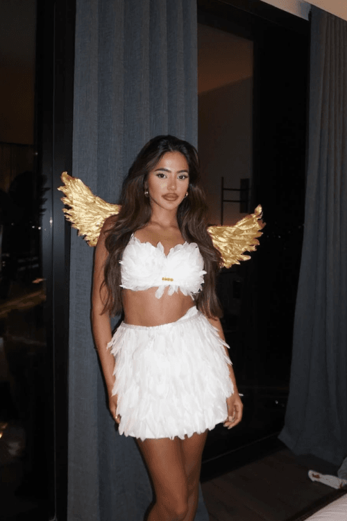 This angel costume is positively dazzlingāwhite feathered skirt and bralette paired with glamorous gold wings for instant celestial vibes! Itās sweet, sparkly, and perfect for anyone who wants a classic costume with a standout twist, ideal for solo wear or paired with a friend dressed as Cupid, another angel, or even a devil for a fun contrast.