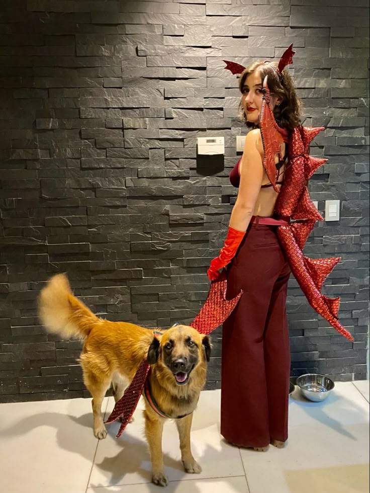 This dragon and dragon-dog costume is pure creative genius and so much fun for Halloween! The bold red scales, dramatic tail, and matching horns bring all the fire, while your four-legged sidekick as a baby dragon takes the cuteness to epic levels. Itās a clever, coordinated idea thatās perfect for best friends, siblings, or anyone wanting to include their pet in a legendary look!
