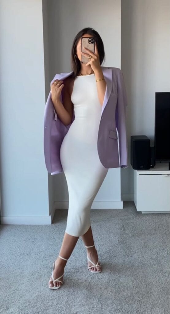 36. Modern Grace: White Bodycon Dress + Purple Blazer Ensemble