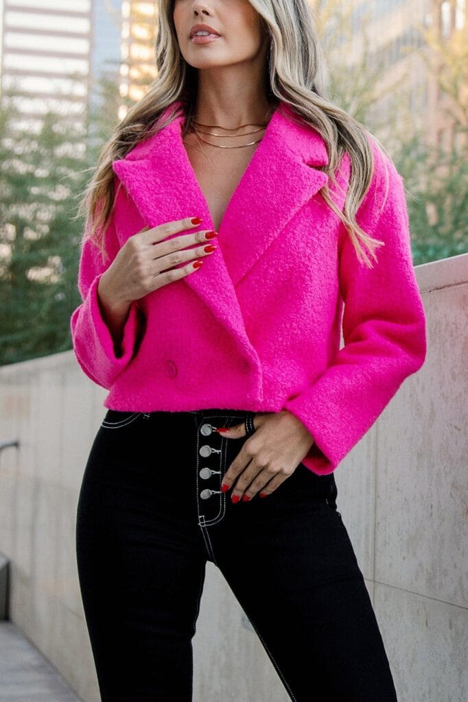 Embrace a touch of edgy romance with the Fuchsia Crop Jacket paired with sleek Black Jeans.