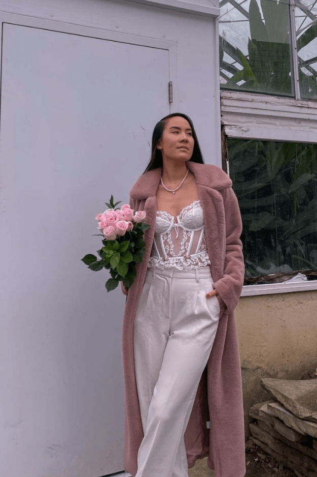 The lacy corset top adds a touch of romance, while wide-leg pants and a furry coat create a stylish and snug combination for a memorable Valentine’s Day look.