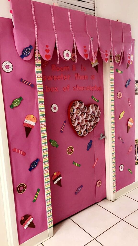 A pink candy-themed door with cupcake liners forming a heart adds a whimsical charm to the classroom. Donuts, candies, and ice cream accents make it perfect for celebrating sweetness.