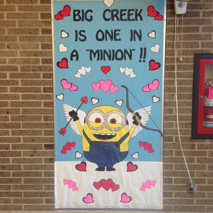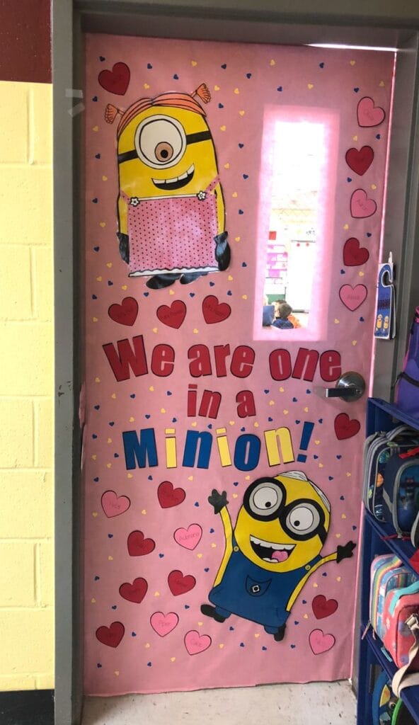This fun and cheerful design features adorable Minions surrounded by hearts on a pink background. It’s a vibrant and playful decoration perfect for engaging younger students.