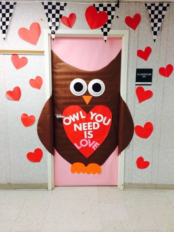 This door showcases a cute owl holding a heart with the message “Owl You Need is Love.” Surrounded by red hearts and festive banners, it’s a heartwarming decoration with a touch of whimsy.