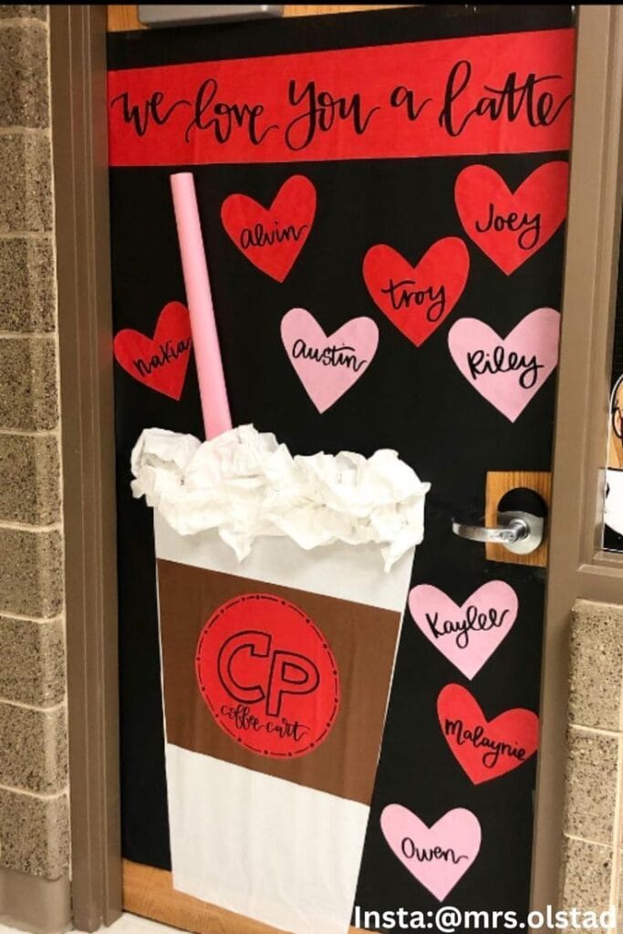 This charming coffee-themed door highlights a latte cup surrounded by hearts with students’ names. It’s a creative and cozy way to spread warmth and love.