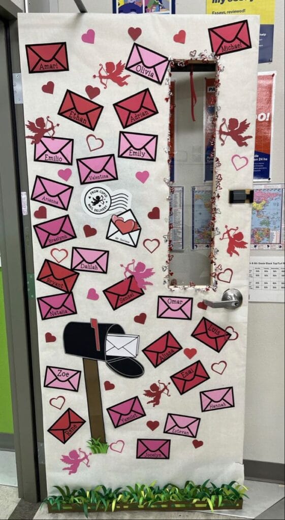 Featuring colorful hearts and an envelope filled with love notes, this door radiates Valentine’s cheer. The glittery accents add a sparkling touch, making it stand out in the hallway.
