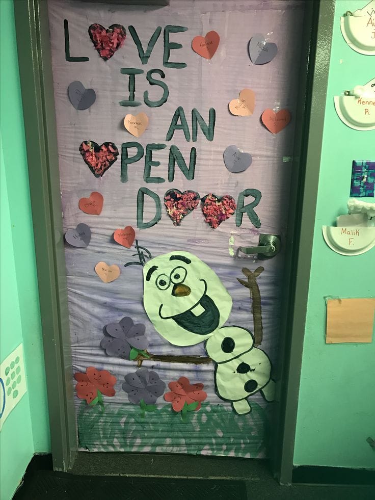 A whimsical Disney-inspired design featuring Olaf from Frozen adds warmth and joy to the classroom. Accented with hearts and floral details, it’s perfect for spreading love.