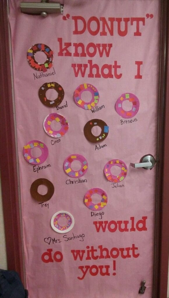 Paper donuts featuring student names and bright sprinkles add a sweet and playful vibe to this Valentine’s-themed door.