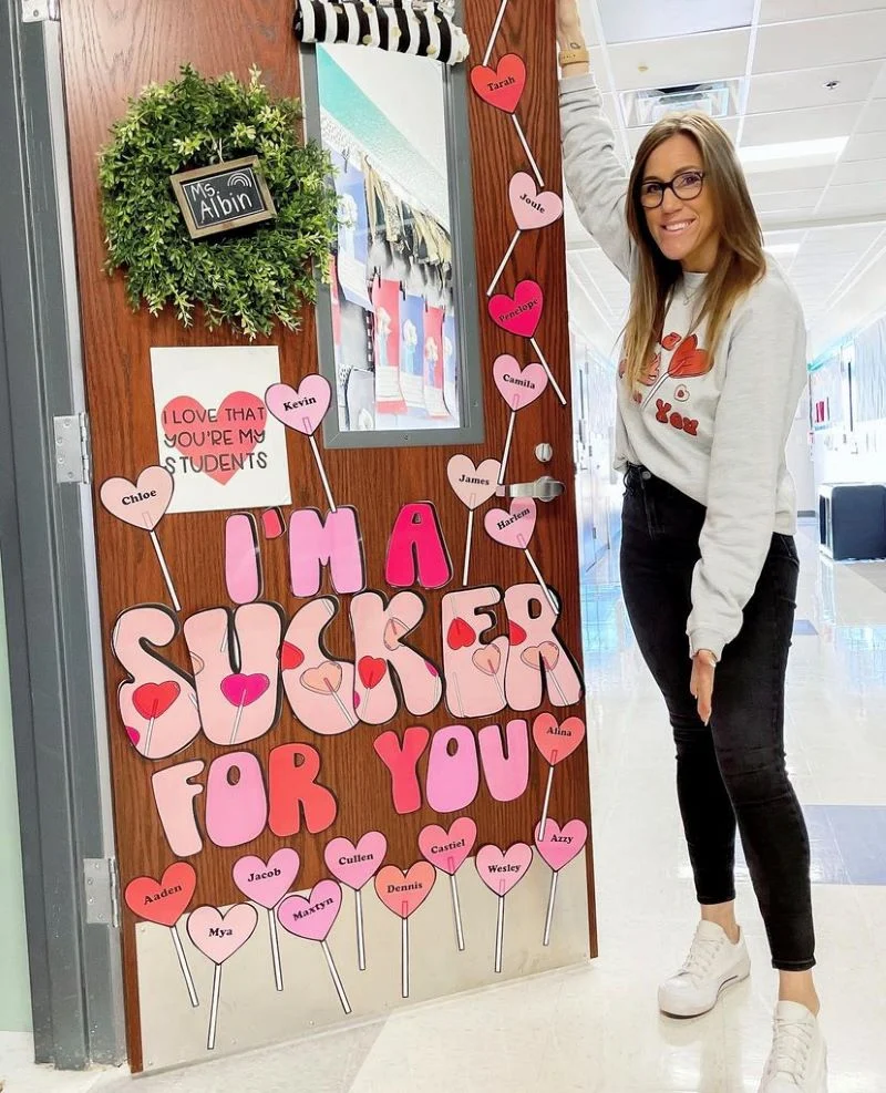 This candy-inspired design features heart-shaped lollipops with students’ names. It’s a sweet way to spread love and appreciation in your classroom.