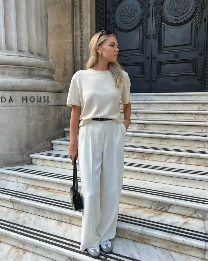 @ mildagudCozy meets chic in this combo! A neutral beige short-sleeve sweater pairs beautifully with wide-leg pants for a refined yet comfortable lookāideal for those cooler, in-between days.
