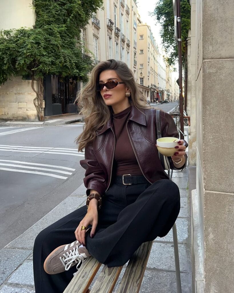@ heloise.guilletLayer up with this effortlessly cool combo! A brown leather jacket over a brown top brings warmth, while the black wide-leg pants keep it sleek and edgy.