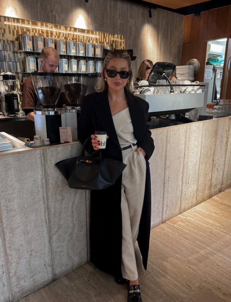 @ allchloeroseThe neutral beige tones of the top and wide-leg pants keep things light, while the black long coat adds a sleek, dramatic layer. Perfect for those chilly days when you still want to look stylish.