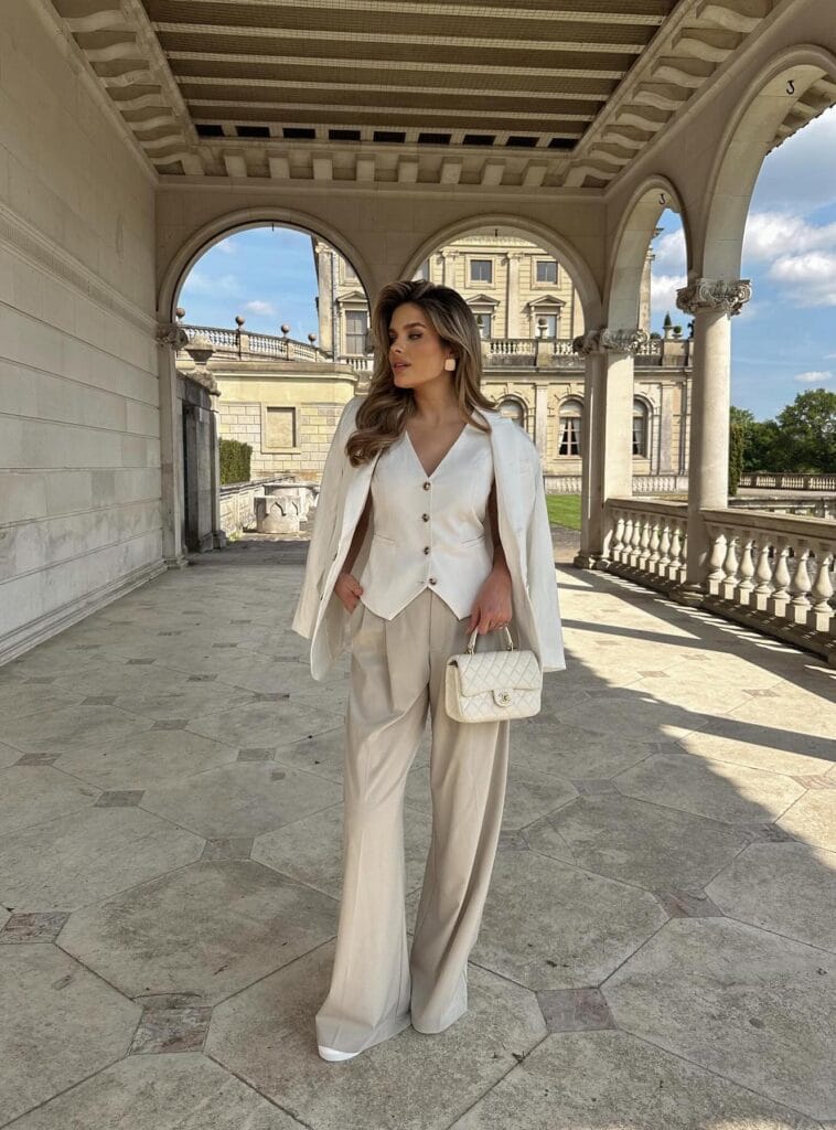 @ chloelloydGo for a full power look with this all-white ensemble. The vest, blazer, and wide-leg pants combination is sharp, modern, and undeniably chic, perfect for making a statement at any formal event.